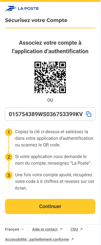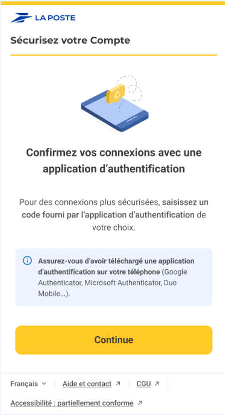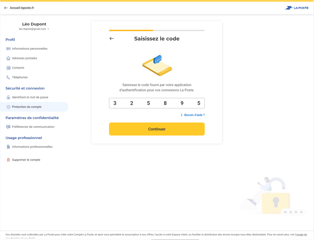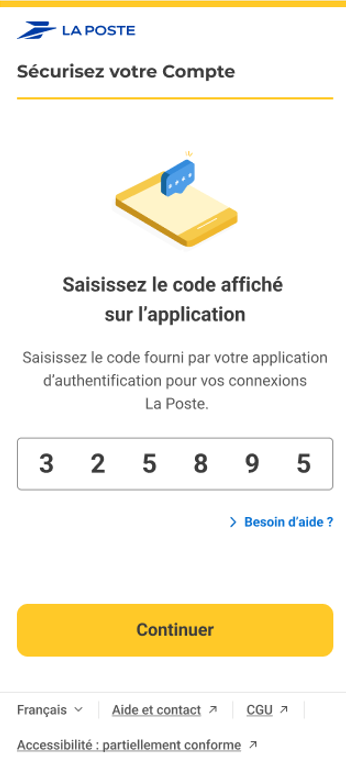 - Une fois votre compte ajouté, saisissez le code à 6 chiffres par votre application pour vos connexion La Poste et cliquez sur “Continuer”