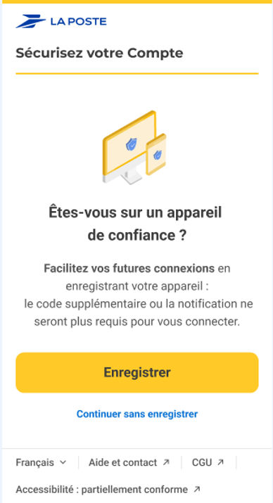 - Enregistrez votre mobile en appareil de confiance pour faciliter vos futures connexions en cliquant sur “Enregistrez”. Si vous ne souhaitez pas enregistrer votre appareil cliquez sur “ Continuez sans enregistrer” (un code vous sera transmis par sms lors de votre prochaine connexion si vous ne déclarez pas votre mobile en appareil de confiance).