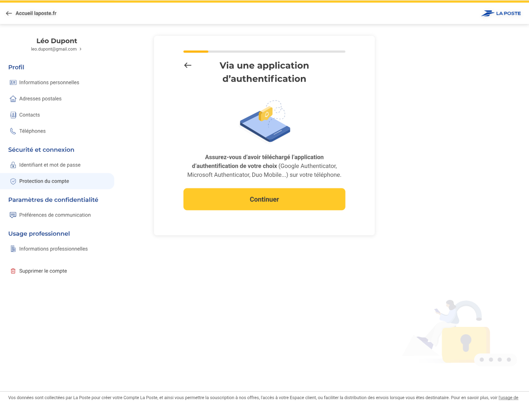 - Assurez vous d’avoir téléchargé l’application d’authentification de votre choix et cliquez sur “Continuer”