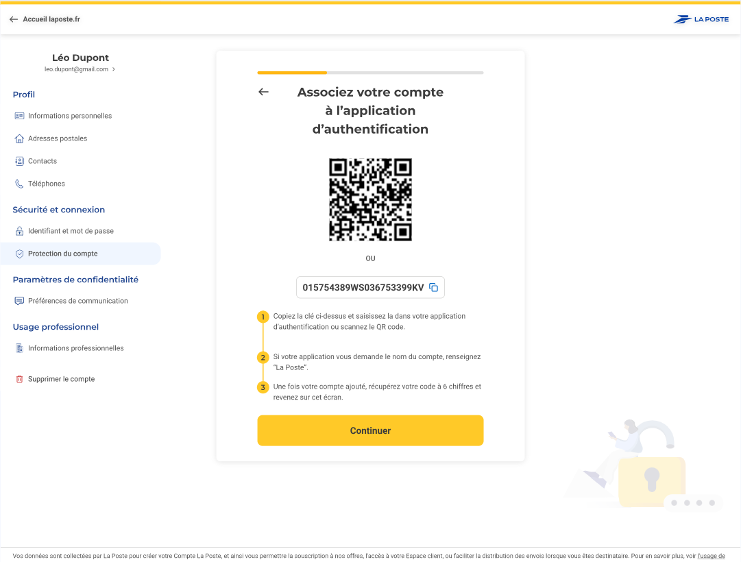 - Scannez le QR code ou copier la clé pour associer votre compte à l’application d’authentification et cliquez sur “Continuer”