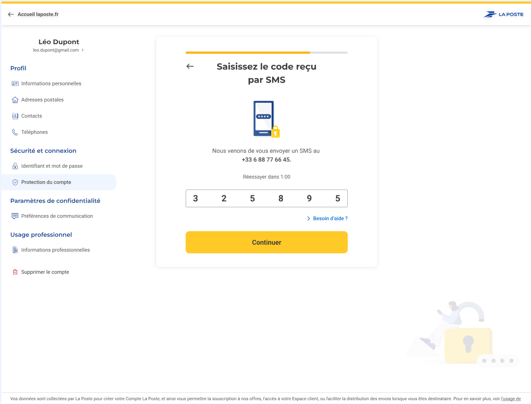 - Une fois votre compte ajouté, saisissez le code de sécurité à 6 chiffres pour vos connexion La Poste et cliquez sur “Continuer”