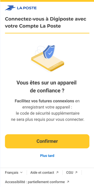 Sur votre PC : un écran vous invite à choisir si vous souhaitez enregistrer cet appareil comme étant un appareil de confiance. Vous pouvez confirmer l'enregistrement en appareil de confiance (confirmer) ou refuser (plus tard). Ensuite, la connexion est confirmée.