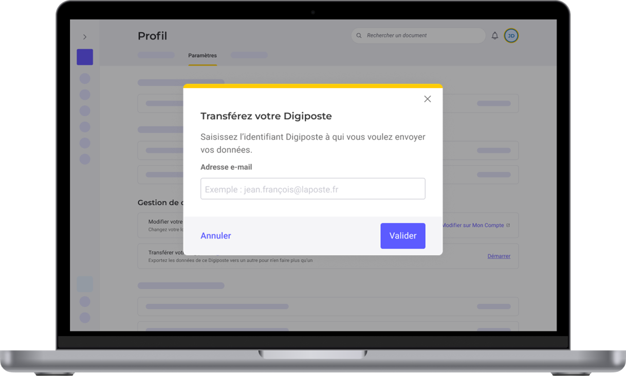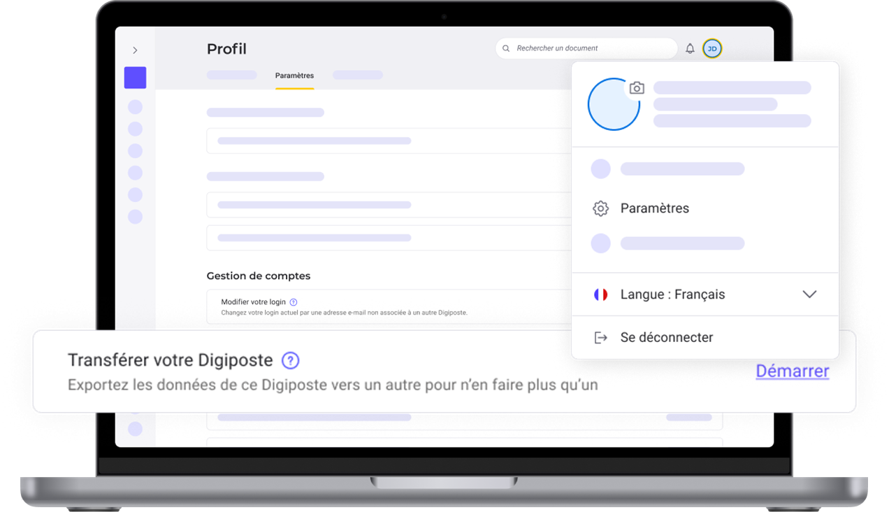- Une fois connecté à Digiposte, cliquez en haut à droite sur votre profil et allez dans Paramètres > Gestion des comptes > Transférer votre Digiposte.