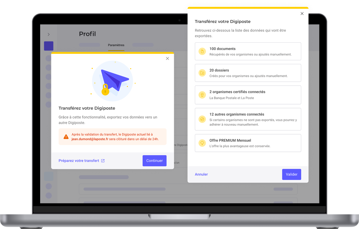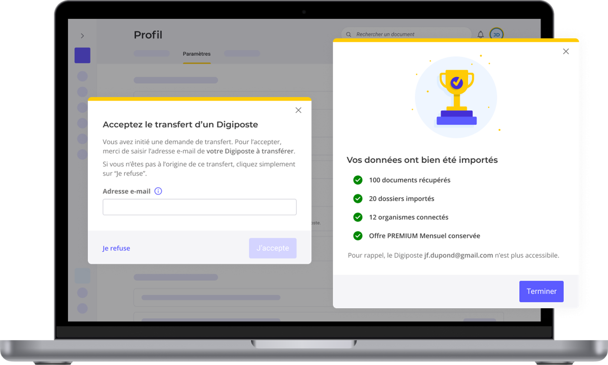- Une fois connecté au Digiposte sur lequel vous voulez transférer vos données, vous devez accepter le transfert. Pour cela, saisissez l’adresse e-mail de votre Digiposte à transférer. Une fois le transfert effectué, vous allez être informé du détail des données importées. NB : Votre ancien Digiposte ne sera alors plus accessible.